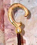 der Bischofsstab (lat.Pedum) ist seit dem 4.Jh. das Zeichen bischöflicher Würde und symbolisiert die sakrale Vollmacht, die dem Bischof für die Kirche verliehen ist. Im Hinblick auf das bischöfliche Hirtenamt (Joh.21, 15 f.) wird er auch als Hirtenstab bezeichnet. Seine Herkunft wird von dem italisch-etruskischen Hirtenstab abgeleitet. Der besaß aus praktischen Gründen ein gekrümmtes Oberteil. Bei uns ist der Bischofsstab erst im seit dem 11.Jh. allgemein gebräuchlich. Im Laufe der Zeit wurde die Krümme immer aufwändiger gestaltet und zu einer Spirale fortentwickelt. In deren Mitte sind häufig religiöse Symbole (z.B. Kreuze) eingearbeitet. |
