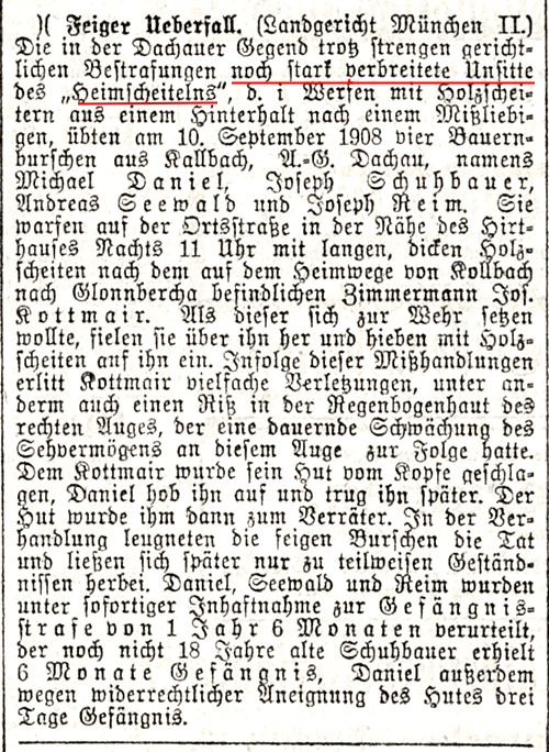 Brauch des Heimscheitelns - Urteil des Landgerichts München II zur Tat am 10.9.1908 |