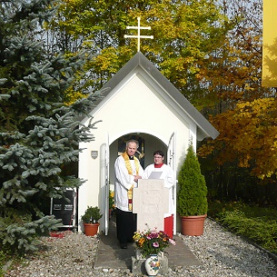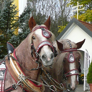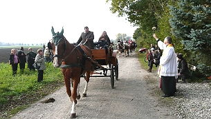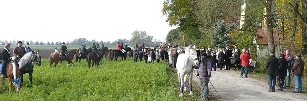 zur Lamm-Gottes-Kapelle Am 30. Oktober kurz vor 10:30 Uhr breitete die Sonne sich erst etwas zögerlich über dem noch ganz leicht vernebelten Dachauer Moos aus. Gleichwohl trafen sich zu dieser Stunde schon die Pferdeliebhaber aus den Gemeinden rund um Mitterndorf, Neuhimmelreich und Eschenried in großer Zahl bei der Lamm-Gottes-Kapelle am Waldesrand südlich der B 471. Reiter und Gespanne wollten an Leonhardiritt und Leonhardifahrt teilnehmen und für sich und ihre Pferde um den kirchlichen Segen bitten.