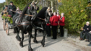 Während sich die Reiter und Gespannführer mitsamt dem Priester und der Blasmusik mit einem ausgiebigen Felderumzug auf die Segnung innerlich vorbereiteten, spielten Günter Wörlein und Ottilie Patzelt auf ihren Waldhörnern. Sie unterhielten die an der Kapelle zurückgebliebenen Wartenden aufs Angenehmste mit stimmungsvollen Weisen. Die Segnung von Mensch und Tier verlief in feierlicher und dennoch lockerer und fröhlicher Art und Weise. Und bei alledem gewann auch die Sonne noch zusehends an Glanz und Kraft.