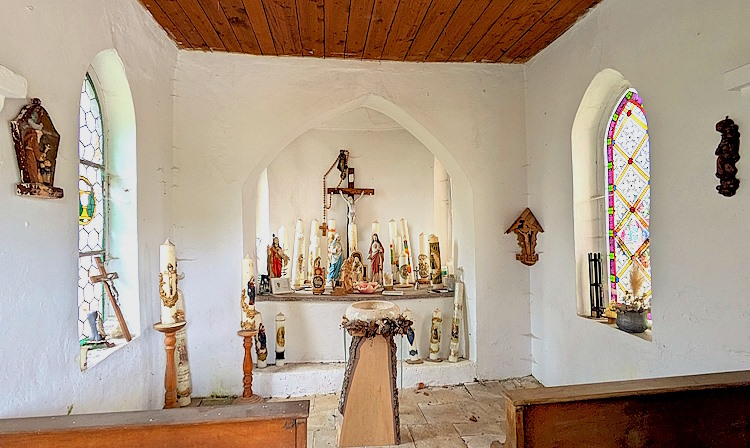 Zwei Fenster haben kleinere Glasmalereien, die das Kreuz