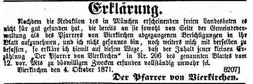aus verschiedenen Orten und Ständen. Und bei alledem nahm sich die Pfarrgemeinde vom Anfang an vor, nach dem Fest dem hochwürdigen Herrn Erzbischof noch eigens den gebührenden Dank auszusprechen, was unterm 12. Juli 1879 auch in einem Schreiben an Hochdemselben in folgender Weise geschah. Als Eingang wurde die von Bürgermeister Ettl gehaltene Rede *) genommen und daran die Worte gereiht: "Das sind, wie Eurer erzbischöflichen Exzellenz bekannt, die Worte, mit denen der Bürgermeister unserer Pfarrdorfgemeinde eure erzbischöfliche Exzellenz bei ihrer Ankunft in Vierkirchen empfangen hat. Das sind die Worte, die er dem Herzen seiner Mitbürger entnommen, am 2. Juli in das liebevolle Herz eurer Exzellenz legte; - Worte, die nicht kalte Berechnung noch schmähliche Heuchelei - Worte, welche die Liebe erfunden, welche Liebe gesprochen hat! Ja, fürwahr! Die Flaggen, die in unserem Dorf aufgehisst waren - sie sind gesenkt; die Masten, auf denen sie über dasselbe hinweg wehten, sie sind gefallen; die unzähligen Triumphbögen und Inschriften sind entfernt; die schönen Lieder der Lehrerschaft sind verklungen; die Töne der Musik verrauscht; das herrliche Feuerwerk des edlen Richard von Kammerberg ist erloschen; die Jubelgäste der Ferne sind in ihre traute Heimat gezogen - alles, alles ist dahin! Eines nur ist geblieben: Das Andenken an eure erzbischöflichen Exzellenz, die Liebe zu Ihnen, hochwürdigster Herr Erzbischof! Jene Liebe - sie erwachte, als uns die Kunde ward, dass unser gütiger Landesvater, König Ludwig II eure erzbischöflichen Exzellenz für den Stuhl des heiligen Korbinian auserwählte - die sich mehrte und steigerte, als der gute Vater der Christenheit, Papst Leo XIII., sie, hochwürdigster Herr Erzbischof unter die hehren Apostel Bayerns einreihte, die durch den 2. und 3.7.1879 eine Höhe, eine Stärke erreichte, dass nichts in der Welt dieselbe je zu löschen im Stande sein wird! Diese Liebe nun ist es auch, die uns antreibt, hiermit eurer erzbischöflichen Exzellenz nochmals den innigsten Dank auszusprechen für Ihren gütigen Besuch unserer Gemeinde, für die gnädige Spendung des heiligen Sakramentes der Firmung an unseren Kindern……. In tiefer Ehrfurcht Eurer erzbischöflichen Exzellenz treugehorsamste Pfarrgemeinde! (Es folgen die Unterschriften) Schließlich sei