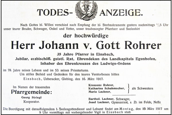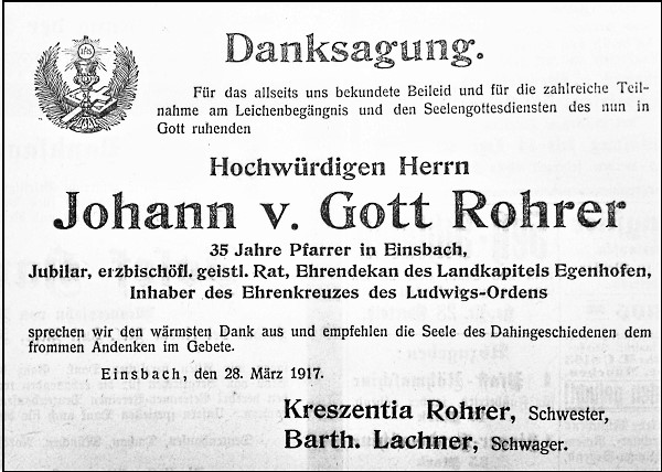 ausgezeichnet hatte. Im Anschluss an den Retrolog legten nun die Schulkinder Kränze nieder. Mit einem weihevollen Grablied nahm dann der Trauerakt ein Ende. Beim darauf folgenden levitierten Trauergottesdienst vor dem mit dem priesterlichen Insignien und mit Blattpflanzen reich geschmückten Katafalk, wurde von dem Männerchor des Ortes Einsbach unter der bewährten Leitung des Herrn Lehrers Königer in vollendet schöner Weise das Requiem von Gruber zur Aufführung gebracht. Und so gut und Einsbachs Pfarrherr, der so viele zur ewigen Ruhe gebettet hatte, selber unter der Erde. Noch lange wird diese gebeugte Priestergestalt mit dem ehrwürdigen, grauen Haupt im Gedächtnis der Pfarrkinder fortleben. Der ewige gute Hirt aber möge ihm für seine ausdauernde Aufopferung im Dienst seiner heiligen Kirche und im Dienst der ihm anvertrauten Seelen belohnen mit dem Frieden des Himmels. Einzug