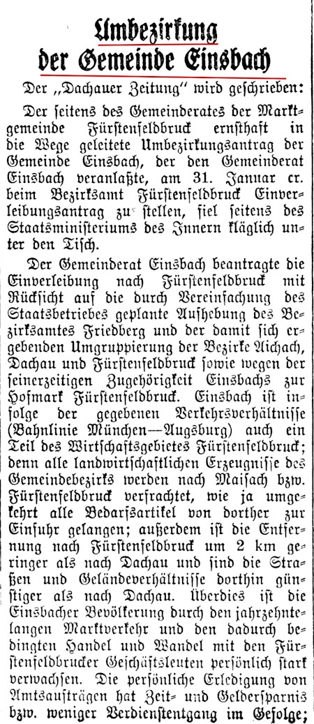 Erteilung der hl. Firmung Einsbach - 18. April. Am gestrigen Sonntag kamen Seine Exzellenz, der hochwürdigste Herr Erzbischof Dr. v. Stein von Fürstenfeldbruck her in die Pfarrgemeinde Einsbach, um daselbst, vormittags um 8 Uhr, zum ersten Mal seit Bestehen des Ortes das hl. Sakrament der Firmung an die berechtigte, festliche geschmückte Kinderschar zu erteilen. Die Ortsfeuerwehr bildete beim Empfang des Kirchenfürsten das Spalier, ferner hatte sich die hochw. Geistlichkeit der Umgebung bzw. des neu errichteten Dekanats Einsbach zu der erhabenen Feier eingefunden. Das Mittagsmahl nahm der Erzbischof im Pfarrhof zu Einsbach ein als Gast des neu ernannten Dekans und Pfarrers, Herrn Michael Rohrer. Nachmittags beehrte der Herr Erzbischof die Filialkirchengemeinde Lauterbach bzw. die dortigen Schulschwestern mit seinem Besuch. Auch bei dem dortigen Schlossgutsbesitzer, Hr. Graf Hundt, sprachen Se. Eszellenz vor, worauf selbe wieder nach Fürstenfeldbruck zurückfuhren.