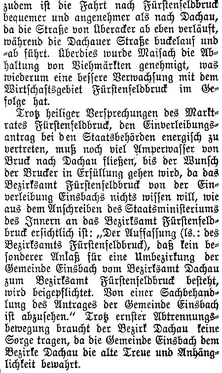 des neuen Pfarrherrn in Einsbach Schon seit frühem Morgen prangte der Ort in festlichem Schmuck. Sollte doch die Pfarrei Einsbach heute einen Freuden- und Ehrentag erleben, nämlich den Einzug des neuen Pfarrherrn, Johann Nepomuk Seidl, bisher Expositus in Steingau. Die Empfangsfeierlichkeiten selber war der ersten Zeitläufe wegen ohne viel äußeren Aufwand, nichts desto weniger aber sehr herzlich und eindrucksvoll. Eine größere Abteilung von Radfahrern, Reitern und Fuhrwerken sammelten sich am Nachmittag, ½ 3 Uhr in Maisach an und erwartete am Bahnhof die Einfahrt des Zuges. Nach Ankunft und kurzer Begrüßung des neuen Pfarrers bewegte sich der Empfangszug in langer schöner Linie bei flottem Tempo gegen Einsbach, während sich am weltlichen Horizont gewitterschwangere Wolken zusammenballten. Im Filialdorf Überacker bewillkommte die Jugend mit Herrn Hauptlehrer Werner an der Spitze den neuen Pfarrherren. In der Gemarkung Einsbachs hatte sich unterdessen bei der errichteten Ehrenpforte eine festlich gestimmte Menschenmenge angesammelt. Der Männerchor des Ortes sang bei Eintreffen des Zuges unter der sicheren Leitung des Herrn Lehrers Königer das schneidige "Gott, grüße dich" von Julius Sturm. Weißgekleidete Mädchen trugen hier und am Kirchenportal sinnige Gedichte vor und überreichten dem neuen Pfarrvorstand jedes Mal einen prächtigen Blumenstrauß aus Rosen und Nelken. Unter dem Geläute der Glocken bewegte sich nun der Zug zur Kirche, wobei bereits ein feiner Sprühregen einsetzte. Dem Zug voran schritten weißgekleidete Mädchen, die verschiedenen hiesigen Vereine mit Fahnen. In der Kirche begrüßte der bisherige Vikar, Georg Striegel, den neuen Pfarrvorstand aufs Herzlichste. In seiner Erwiderung dankte der neue Pfarrer in bewegten Worten für den ehrenden Empfang und mit einer kurzen sakramentalen Andacht schloss dann die Einzugsfeierlichkeit, die gar manchen unvergesslich bleiben wird.