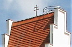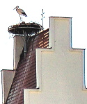 hat einen vierfach getreppten Stufen-Giebel. Am First ist eine Vorrichtung
