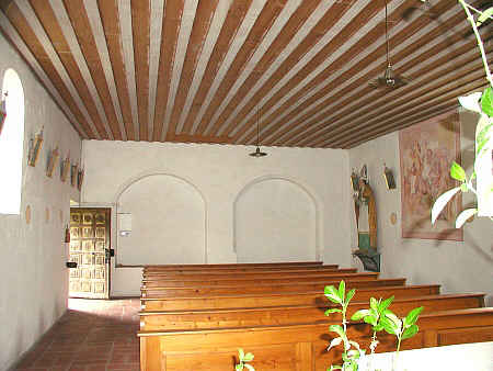 Kirchenraum ist mit einer Holzbalkendecke überzogen,