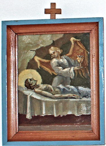 dem Altartisch stehen neben dem Tabernakel zwei bemalte, als Reliquienbehälter
