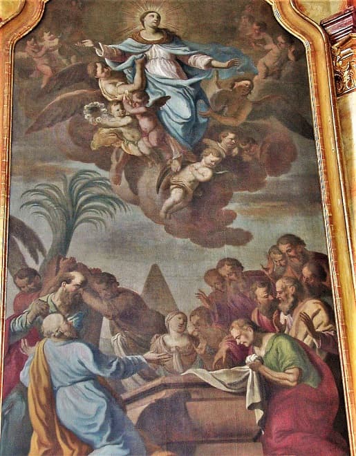 Maria wird von Engeln in den Himmel gehoben. Ein Engel hält die Rosenkrone für die Königin des Himmels bereit. Im unteren Teil des Bildes umstehen die 11 Apostel und zwei Frauen verwundert den leeren Sarkophag. Im Hintergrund Palmen und eine Pyramide. Hinweis: Der Name Sarkophag stammt vom griechischen "Sarkophagos" und bedeutet so viel wie "Fleisch fressend". Diese ungewöhnliche Bezeichnung weist auf das Material des Sarkophags, den Kalkstein, hin. Der soll die Bestatteten -mit Ausnahme der Zähne- innerhalb von 40 Tagen verwesen lassen. 133)