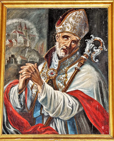 Bischof. Und als sehr frommer Mann. Auf vielen Abbildungen wird