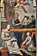 den Säulen Altarblätter mit Gemälden der Heiligen Familien.