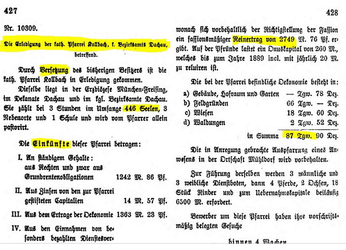 Am vergangenen Sonntag fand die feierliche Installation des Herrn Pfarrers Gangkofer in Kollbach statt. Als weltlicher Commissär fungierte der königliche Bezirksamtsassessor Herr Emil Schöller von Dachau und als geistlicher Commissär Herr Dechant Mederer von Haimhausen. Nach vorausgegangenem feierlichen Gottesdienst bewegte sich der von der Gemeinde- und Kirchenverwaltungs-mitgliedern, sowie der Schuljugend begleitete Zug vor das Pfarrhaus, woselbst die Vorstellung des Herrn Pfarrers seitens des königlichen Commissärs, Herrn Assessor Schöller, stattfand, welch letzterer in gediegenen Worten zu der versammelten Menge sprach und dessen kräftige Rede in den herrlichen Worten des Welterlösers gipfelten: "Gebet dem Kaiser was des Kaisers ist und Gott was Gottes ist." Bei dieser feierlichen Handlung beteiligte sich auch die dortige gut organisierte Feuerwehr, deren Hauptmann dem weltlichen Herrn Commissär, sowie dem Herrn Pfarrvorstand gegenüber seinen tiefgefühlten Dank für allseitige Unterstützung in warmen Worten ausdrückte und schließlich ein "Gut Heil" ausbrachte.