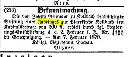 Genehmigung der Jahrtagsstiftung von Joseph Neumayr - Freisinger Tagblatt- 12.02.1870 |