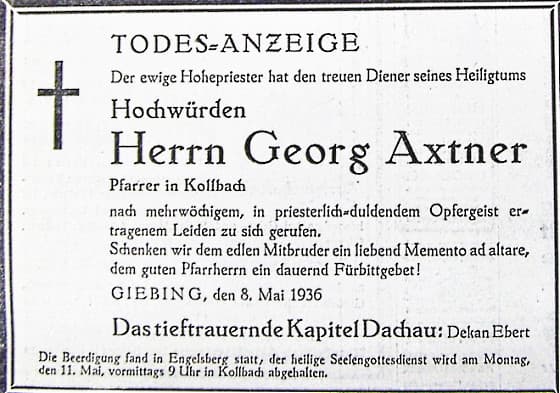 Trauerfeier für den verstorbenen Pfarrer Georg Axtner - Amperbote vom 13.05.1936 |