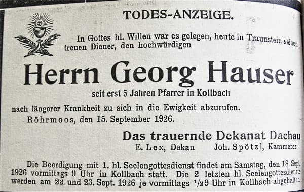 Hochwürden Pfarrer Georg Hauser verstorben - Amperbote vom 18.09.1926 |