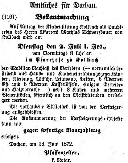 Versteigerungg d.Nachlasses von Pfr Mathias Schwarzbauer -Freisinger Tagblatt-27.6.1872 |