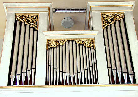 Schleiflade. Ein Teil der Orgel ist als Brüstungswerk