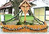 der Kirche steht neben der Bushaltestelle ein hölzernes Wegkreuz.