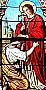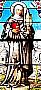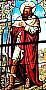 Im zweiten Fenster erkennt man einen hl. König vor dem Hintergrund einer befestigten Stadt. Er hält einem Wanderstab in der Hand und hat die Augen andächtig zum Himmel erhoben. Wen dieses Bild darstellen soll, ist mir ebenfalls nicht bekannt. | |||