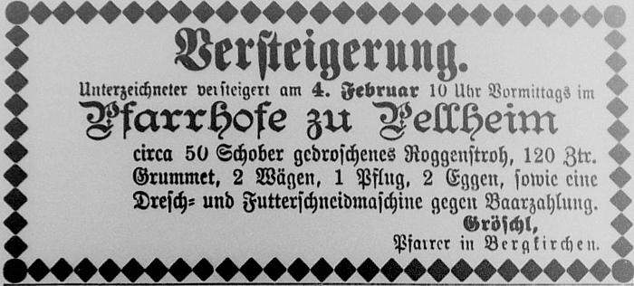 Installation von Pfarrer Gröschl in Pellheim Am vergangenen Sonntag, den 14. September, fand die feierliche Installation des Herrn Pfarrers Gröschl in Pellheim statt, zu welcher sich eine bezirksamtliche Kommission früh um 8 Uhr von Dachau aus nach Pellheim begab, woselbst auch bereits der erzbischöfliche Commissär, Herr Dekan Mederer von Haimhausen eingetroffen war. Seitens des geistlichen Herrn Commissärs wurde nun Herr Pfarrer Gröschl nach der vorausgegangenen üblichen Feierlichkeit in der Kirche seiner Pfarrgemeinde in warmen und herzlichen Worten vorgestellt. Nach beendeter kirchlicher Feierlichkeit begab sich der Zug begleitet von der Schuljugend und der Lehrerschaft zurück vor das Pfarrhaus, woselbst der weltliche Commissär, Herr Bezirksamtsassessor Schöller, in einer gediegenen Rede den neuen Pfarrherrn seiner Gemeinde, sowie der Schuljugend in echt christlich ermahnender Weise vorstellte und schließlich darauf hinwies, dass jene Jesusliebe, in welcher die ganze Religion gipfelt, betätigt werden möge, und nur dann wird die Armut nicht vergebens an die Türen klopfen. Nach beendeter Ansprache seitens des Herrn weltlichen Commissärs wurden in der Pfarrhof selbst die schriftliche Übergabeverhandlungen gepflogen, welchen auch die Gemeinde- und Kirchenverwaltungsmitglieder beizuwohnen hatten. Anmerkung: Pfarrer Gröschl hat später die Pfarrei Bergkirchen (bis 1904) übernommen.