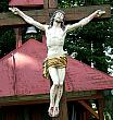 nur mit den Füßen ans Kreuz genagelt. Die Arme sind, wie in der