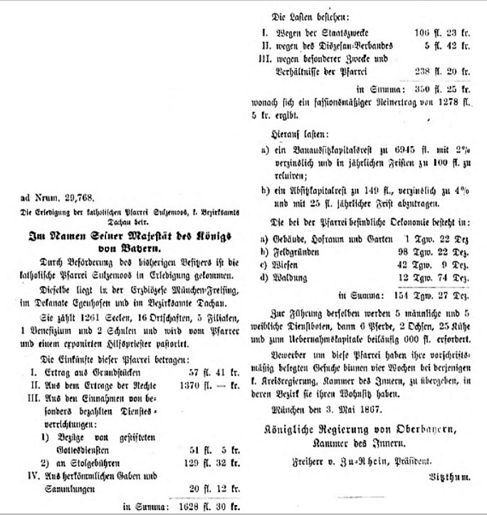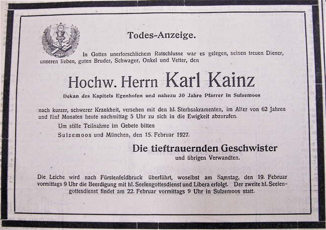 Verlust Am 5. Februar verließ die Gemeinde Sulzemoos der hochwürdige Herr Pfarrer und Kammerer H. B. Kaußler, um seinen Posten als Benefiziat in Odelzhausen anzutreten. Dieses Benefizium wurde ihm vom Hochwürden Herrn Erzbischof verliehen, als wohlverdienter Ruheplatz für seine langjährigen und eifrigen Dienste in der Kirche, Schule und im Staat. Herr Pfarrer Kaußler war seit 1867 dahier unermüdlich tätig und war früher über 12 Jahre im Seminar zu Neuburg als Präfekt und Professor angestellt, wo er heute noch im besten Andenken steht. Die Pfarrgemeinde Sulzemoos hart an ihm einen eifrigen Seelsorger verloren und wünscht ihm noch viele glückliche Jahre auf seinem Ruheposten; sich selbst aber wieder einen ebenso tüchtigen und treuen Priester wie Herr Pfarrer und Kammerer Vinzenz Kaußler war. Recherchiert von Hubert Eberl, Bergkirchen Todesanzeige Pfarrer Karl Kainz Recherchiert von Hubert Eberl, Bergkirchen