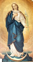 Links: Maria als Immaculata auf einem Halbmond stehend