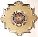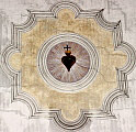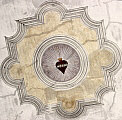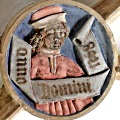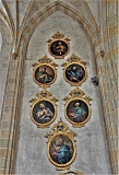 münden oben in runde Schlusssteine, die mit Inschriften und Bildern