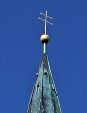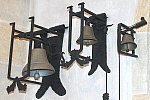 Spitzhelm aus Kupferplatten; in ihm hängen drei Glocken, die 1606