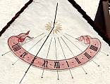 An der Stirnseite des Vorhauses ist eine Sonnenuhr aufgemalt.