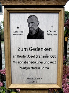 Das Kreuz aus "Eisenhofer Eichenholz" steht vor dem Geburtshaus Grahamers in der unteren Dorfstraße. Es wurde Anfang Oktober 2016 von Pfarrer Bula und Pater Maurus aus St.Ottilien, dem Ordenshaus von Grahamer, eingeweiht. |