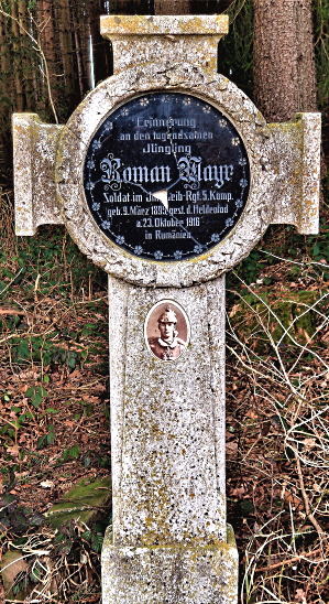 -am Altowald Altomünster - Foto: Helmut Kurzböck Text: Erinnerung an den tugendsamen Jüngling Roman Mayr Soldat im ...Rgt. 5.Komp. geb. 9.März 1895, gest.d.Heldentod a.23.Oktober 1916 in Rumänien