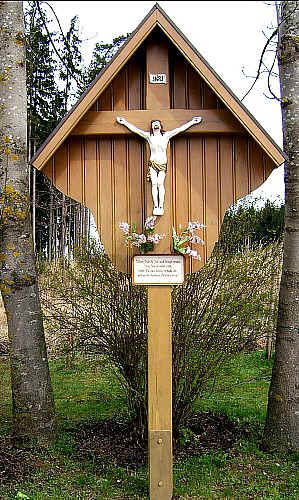 -bei Arzbach- Text: Wenn dich die Zeit auch drängt voran, Dein Ziel ist in der Fern siehst Du dies Kreuz, so halte an und grüße dankbar Deinen Herrn.