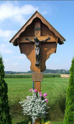 Text: Das Kreuz, das am Wege steht, mahnt jeden der vorübergeht. O Wanderer halte Rast, trotz aller Eil und Tempohast