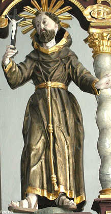 einem Kruzifix abgebildet, weil er in einer Vision Christus von einem