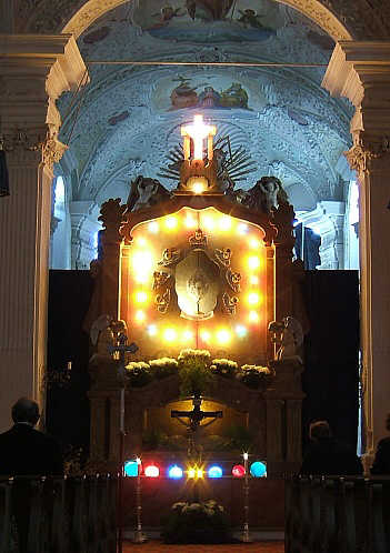 Darüber thront eine Monstranz, umgeben von sieben Putten und bunten Glühlampen.