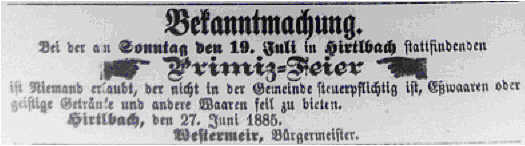 Am verflossenen Sonntag den 19. Juli wurde in Hirtlbach das Primizfest des hochwürdigen Herrn Johann Ev. Huber, Lenzbauernsohn von dort, in würdiger Weise gefeiert. Schon an den vorhergehenden Tagen waren zahlreiche Hände mit dem Winden von Kränzen und Girlanden beschäftigt und an den Straßen und auf dem Weg zum Primizplatz wurden geschmackvolle Triumphbögen aufgestellt.