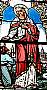 Im zweiten Fenster erkennt man einen hl. König vor dem Hintergrund einer befestigten Stadt. Er hält einem Wanderstab in der Hand und hat die Augen andächtig zum Himmel erhoben. Wen dieses Bild darstellen soll, ist mir ebenfalls nicht bekannt. | |||