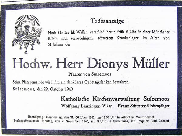 nicht schlägt und nicht zeigt. Und nun steht im Turm eine neue Uhr, ein Werk der Firma Hemberger aus Erling, Andechs, ein Werk modernster Konstruktion, mit Präzisionsregulierung, von bester Arbeit und solidester Ausführung in jeder Beziehung, ein Werk, das den Meister lobt und ihn aufs beste empfiehlt. In 10tägiger Arbeit erfolgte die Aufstellung, und es war eine mühevolle, zum Teil auch gefährliche Arbeit, so namentlich das Abnehmen der alten und das Anbringen der neuen Zifferblätter. Es konnte einem fast etwas gruselig werden, wenn man zusah, wie der "Nazi", auf einem Holzbengel sitzend und fest angeseilt, aus dem Schalloch kroch, sich herunterließ und an den Ungetümen von Zifferblättern hantierte. Glücklicherweise ging alles ohne Unfall vor sich. Freundlich leuchten die neuen Zifferblätter mit den vergoldeten Zeigern herab vom Turm, der allerdings ziemlich finster und grau aussieht. Hoffen wir, dass derselbe in nicht zu ferner Zeit einen neuen "Janker" oder besser gesagt "Überzieher" bekommt; dann passt alles schön zusammen: Friedhofmauer, Kirchenuhr und Kirchturm. Der Gemeinde Sulzemoos, namentlich dem rührigen Herrn Bürgermeister Seldmeir, gebührt Anerkennung und Dank für die große Opferwilligkeit, die sich bei Anschaffung der neuen Kirchenuhr zeigte. Recherchiert von Hubert Eberl, Bergkirchen Todesanzeige Pfarrer Dionys Müller Recherchiert von Hans Schertl |