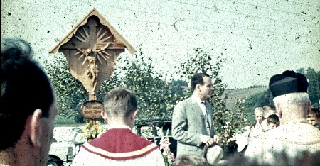 ![]() Kreuzeinweihung am 5.9.1964. Im Bild Landrat Pestenhofer u. Pfr.Albert (Bild:H.Eberl) |